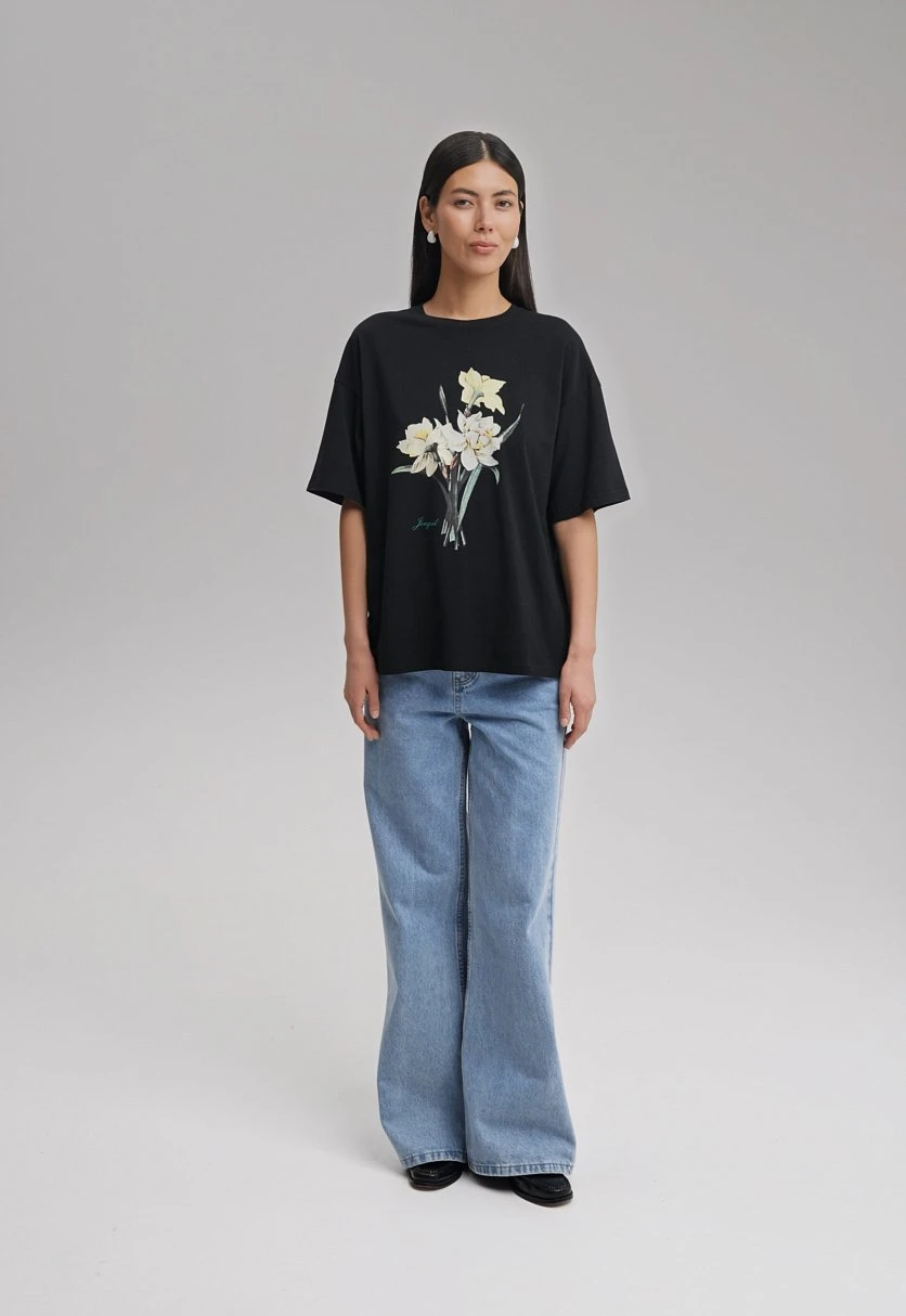 Футболка свободного кроя с нежным принтом на груди — комфортная база для непринужденных образов на каждый день. Универсальна для сочетаний с джинсами, нестрогими брюками и юбками. Выполнена из хлопкового трикотажа джерси одинарного плетения. Это натуральный, гипоаллергенный материал, мягкий на ощупь и дышащий.